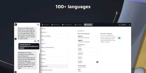 Build intelligent and automated customer support in one language and allow Ada to instantly translate to over 100 languages. Provide multilingual support across almost any digital channel.
