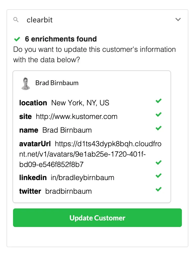 Configure Clearbit to get enriched customer data such as a customer’s location, site, social channels, and more for a more comprehensive view of your customer that’s accessible directly within a customer’s profile in Kustomer.