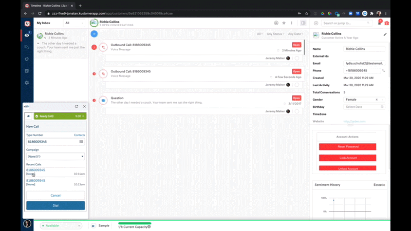 Integrated into Kustomer, the Five9 solution brings powerful outbound dialer capabilities to your organization. The Five9 Predictive Dialer automates outbound dialing – blending proactive outbound customer calls with inbound phone traffic. Five9 supports predictive, power, progressive, preview, and TCPA manual touch dialing.