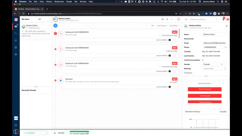 Five9 screen pops blend directly into the Kustomer environment, giving agents a complete picture of each problem before they engage the customer. Five9 also puts the customer’s entire contact history at the agent’s fingertips so they can better understand the customer’s needs and better fulfill their omnichannel expectations across voice, email, SMS, chat, and social messaging apps.