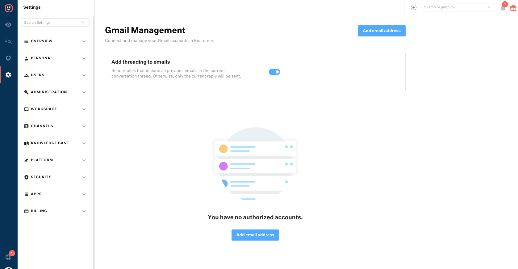 The Kustomer integration for Gmail is available for customers on all plans. With a rapid, code free setup, our native Gmail integration directly connects your Google Business email accounts to the Kustomer platform.