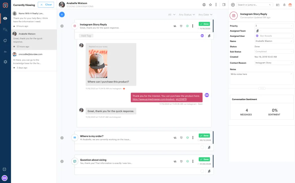 Ensure that Instagram Direct Messages and Comments automatically go to the right agents at the right time by setting up routing rules and AI-powered automations. Allow agents to quickly gauge how the customer is feeling and facilitate social listening with Kustomer’s sentiment analysis tool.