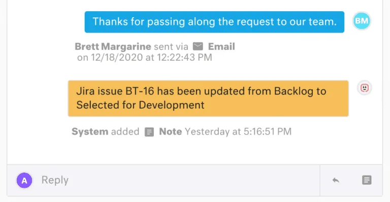 Get a holistic view of issue status changes directly within the linked Jira issue. Status change updates will update automatically and appear within the Conversation in the form of a note.