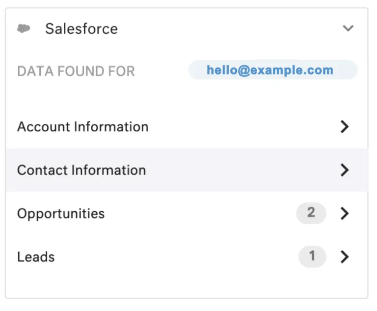 Integrating Salesforce with Kustomer adds a Salesforce Insight Card that appears automatically when looking at a Customer or Conversation in the timeline. Kustomer uses email addresses as the unique identifier to match a Customer with a Contact in Salesforce and displays in the Insight Card any Accounts, Leads, or Opportunities associated with that Contact.