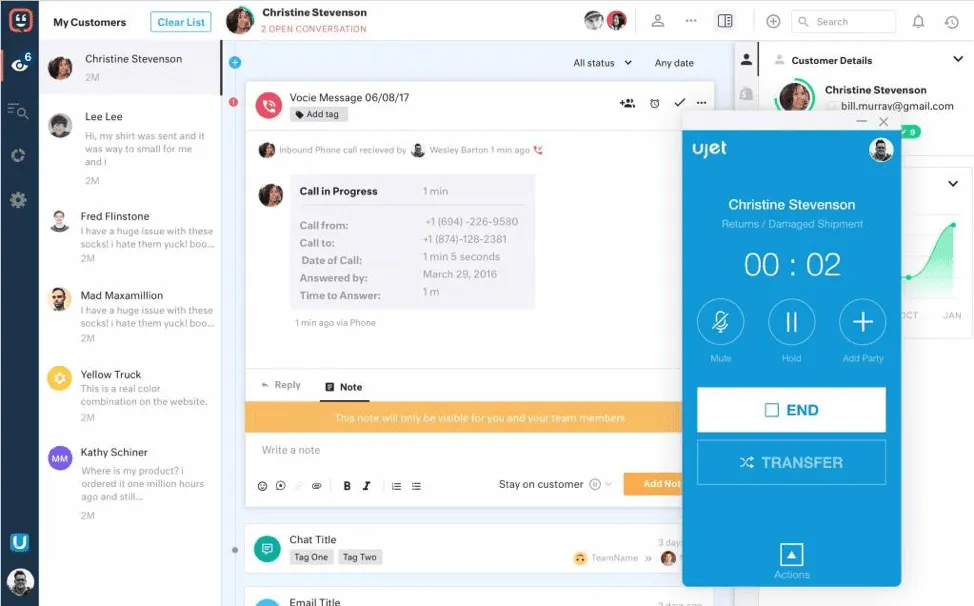UJET offers a holistic platform for voice and chat channels to provide streamlined, personalized customer support. The UJET voice channel has a seamless integration into the Kustomer timeline, enabling your sales and support teams to boost productivity, shorten first call resolution times and deliver a higher level of customer service.
